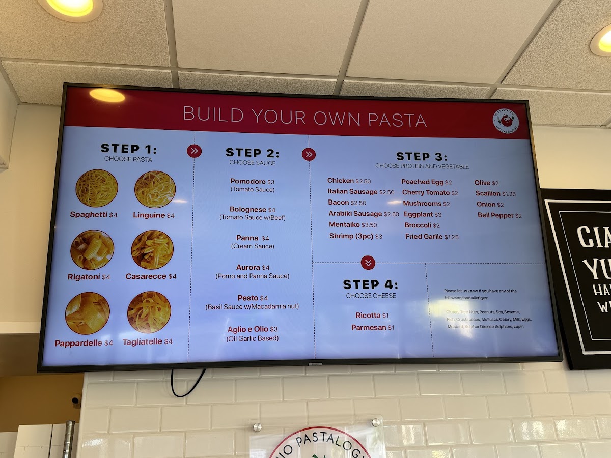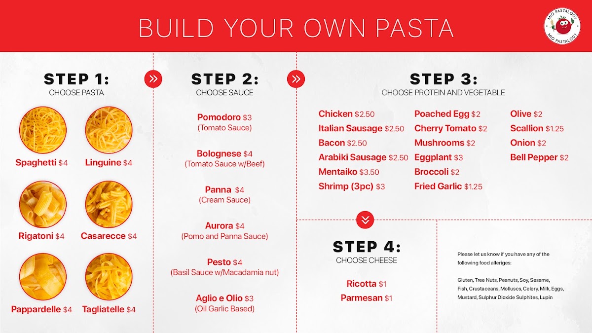 Choose pasta, sauce, and toppings